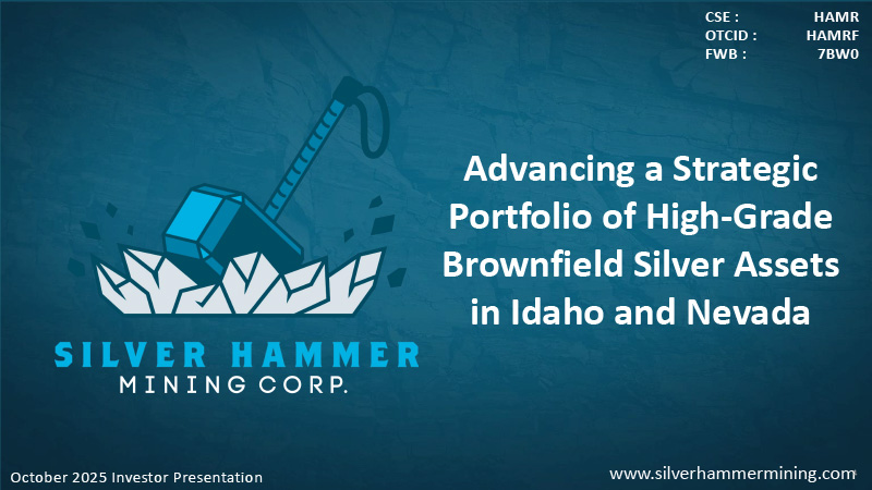 Silver Hammer Mining Corp. (CSE: HAMR; OTCQB: HAMRF) is a tightly-held junior resource company advancing its 100%-controlled portfolio of precious metal project in the USA, including the flagship past-producing high-grade Silver Strand Mine in the Coeur d’Alene Mining District in Idaho, USA, as well as both the high-grade Eliza Silver Project and the Silverton Silver Mine in Nevada. Idaho and Nevada are both currently ranked #7 and #3, respectively, in the world by the Fraser Institute as the best place for investment in the mineral industry. The Company also controls the interesting Lacy Gold Project in British Columbia, Canada.